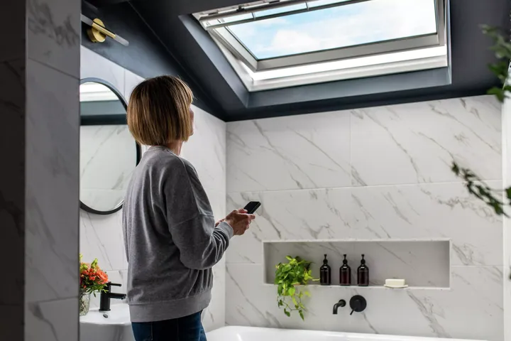 Im Winter müssen Sie im Dachgeschoss auf eine clevere Kombination von Lüften und Heizen setzen. Auf der einen Seite müssen Sie durch das Heizen die Temperatur angenehm halten, andererseits müssen Sie häufig lüften, um die hohe Luftfeuchtigkeit nach draußen abzuleiten. Mit elektrischen Dachfenstern können Sie per Fernsteuerung daher selbst schwer zugängliche Fenster zum Quer- und Stoßlüften öffnen. Und die intelligente Raumklimasteuerung VELUX ACTIVE sorgt automatisch für die richtige Temperatur und gute Raumluft im Dachgeschoss.