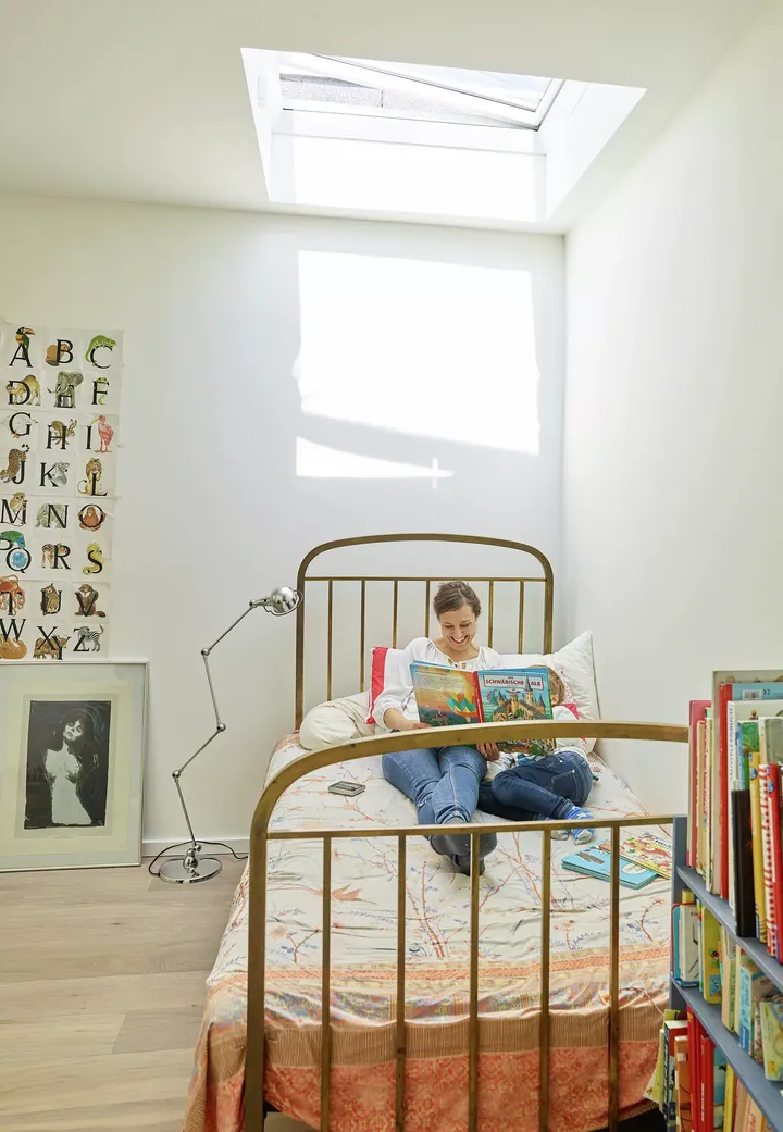 Tageslicht wirkt sich positiv auf die Stimmung aus und kann die Konzentration bei Kindern steigern. Über das Auge aktiviert Sonnenlicht die Bildung des Botenstoffes Serotonin, der Motivation und Kreativität fördern kann. Darüber hinaus hat Serotonin positive Einflüsse auf unsere Entspannung und einen gesunden Schlaf, während Schlafmangel äußerst negative Folgen für die kindliche Konzentrationsfähigkeit hat. Kinderzimmer sollten daher mit – möglichst großen – Fenstern ausgestattet sein. Sofern sich das Kinderzimmer im Dachgeschoss befindet, sind Dachfenster die beste Wahl und lassen viel Tageslicht herein, deutlich mehr als eine Gaube oder ein gleich großes Fassadenfenster.