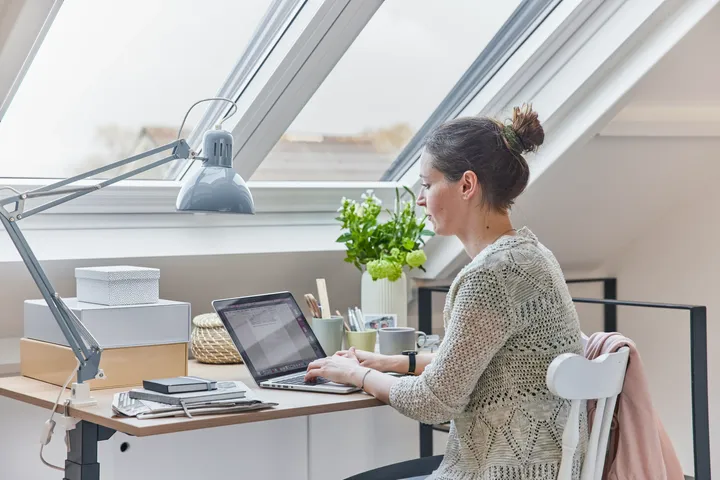 Stellen Sie Ihren Schreibtisch im 90 Grad-Winkel zum Dachfenster auf, um optimales Licht zum Arbeiten zu erhalten.
